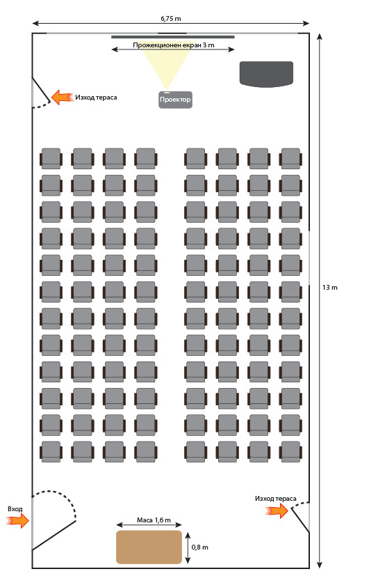 Залата предлага отлична възможност за организиране на семинари, фирмени събития, презентациим конференции други делови прояви. Мултифункционална зала дава възможност за провеждане на приеми и коктейли. Разполага с шумоизолираща система и модерно техническо оборудване. Капацитетът й е до 150 седящи места. Залата може да бъде подредена според нуждите на всяко едно събитие.